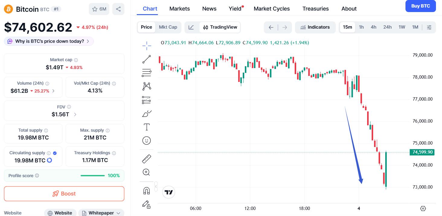 比特币盘中跌近8%、跌破7.3万,抹平特朗