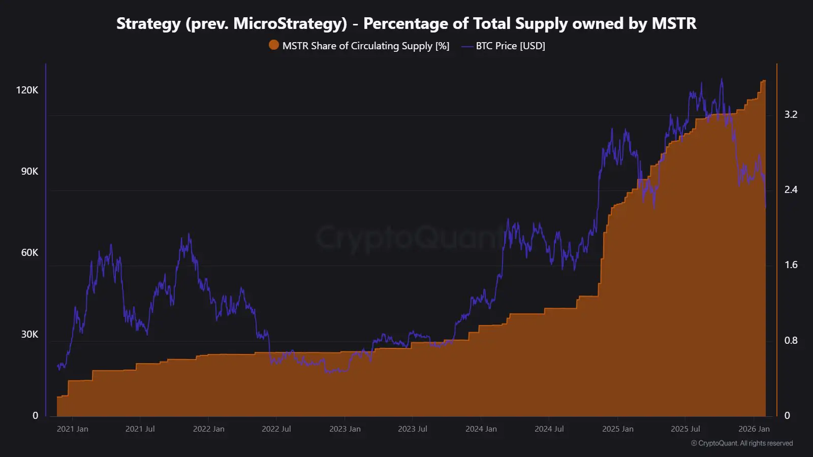 目前,约 61% 的比特币供应量价格高于市场价格,而约 39% 的价格低于市场价格。该策略的平均价格现在几乎与这一平衡点完美契合,使其成本基础成为一个清晰的参考水平。当价格在此水平附近徘徊时,自然会吸引更多关注。