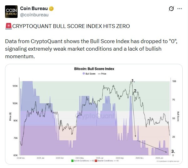 分析平台 CryptoQuant 在最近的一次更新中报告称:比特币牛市评分降至零截至周四,该指标在满分10分中达到10分。据该公司称,这是自2022年1月以来该指标首次达到这一水平,结束了近四年的长期强劲走势。这一消息引发了密切关注链上信号以判断市场走向的交易员们的讨论。