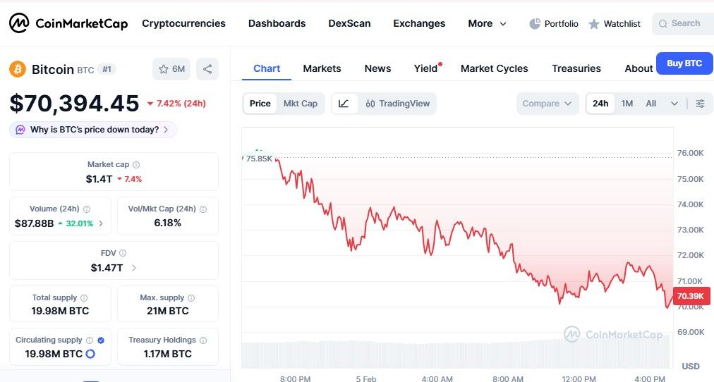 当前比特币数据显示:BTC 当前价格为 70,394.45 美元,当前市值为 1.4 万亿美元。