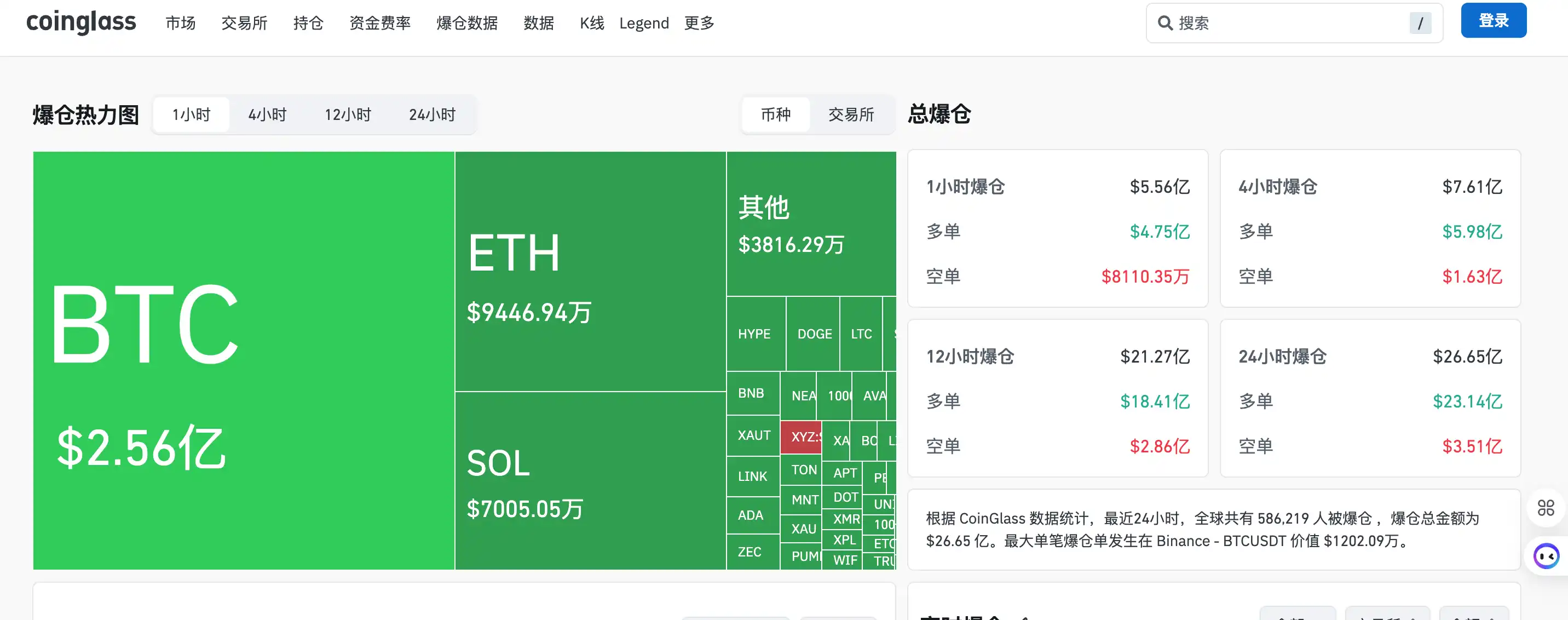 此轮暴跌触发了大规模强制平仓。据 Coinglass 数据显示,过去 24 小时内全市场清算金额超过 26 .6 亿美元,其中多头头寸清算占比高达 87%。单日清算规模在历史上排名第 10 位,仅次于 2025 年 4 月的关税危机引发的抛售。