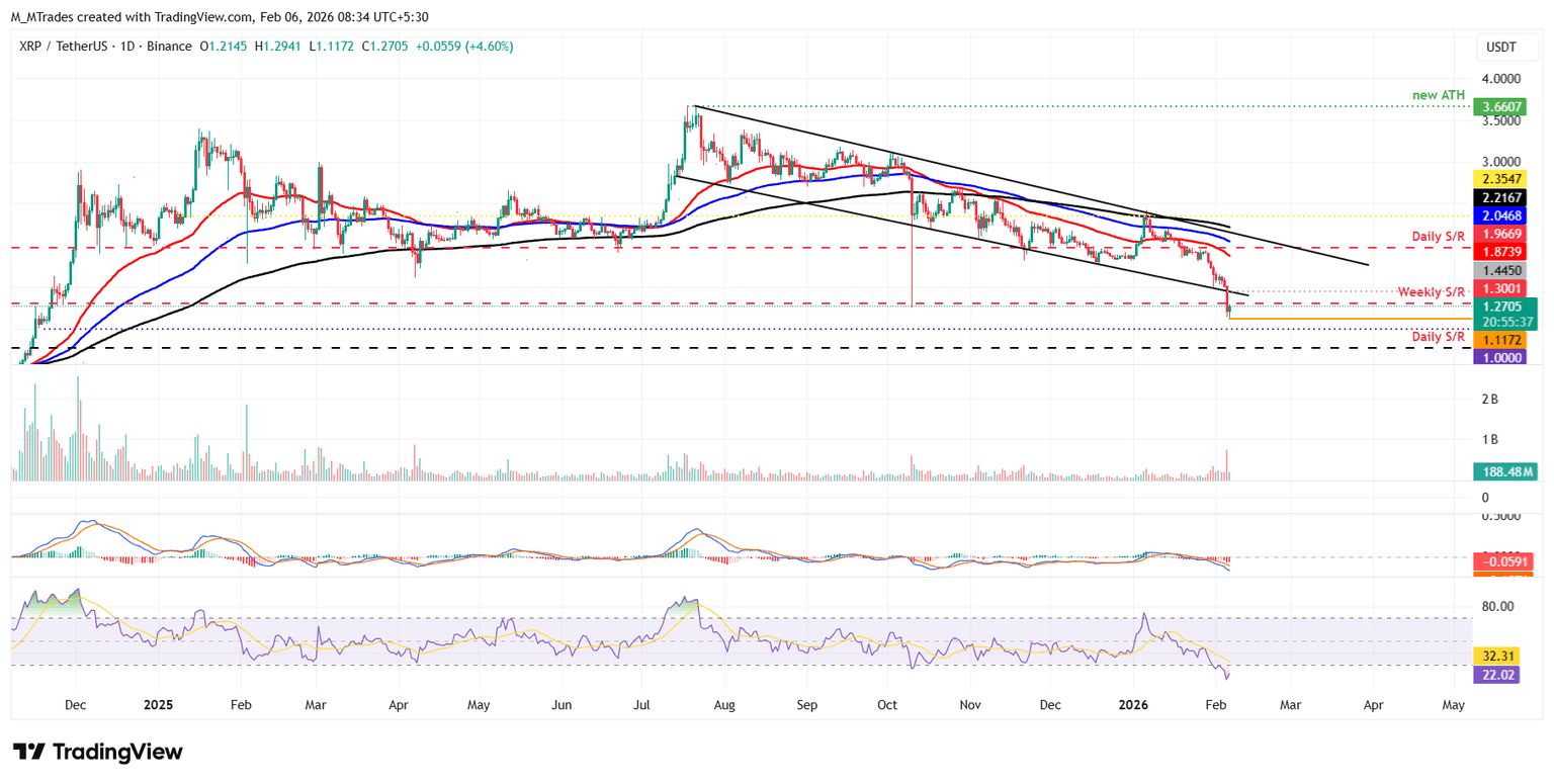 本周迄今为止,XRP 价格已回调超过 20%,周五跌至 1.11 美元的低点,这是自 2024 年 11 月初以来未见的水平。