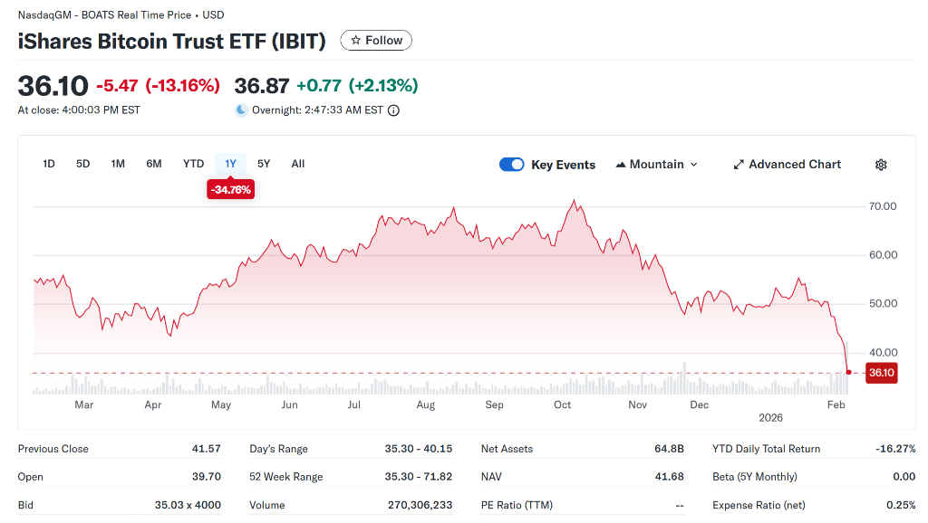据Nasdaq数据,贝莱德比特币现货ETF产品IBIT周四交易量超过2.84亿股,名义价值突破100亿美元,较此前纪录暴增169%。与此同时,IBIT价格暴跌13%至36美元左右,创2024年10月以来新低,年内跌幅扩大至27%。