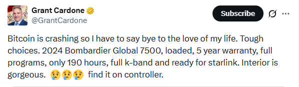 对大多数投资者而言,在市场崩盘期间出售私人飞机意味着流动性危机。然而,就格兰特私人飞机的出售而言,其动机似乎是战略性资产重新配置。卡多内最近在社交媒体上表示:“比特币崩盘了,所以我不得不和我心爱的飞机说再见了。”他指的是他那架顶级飞机,目前在Controller网站上挂牌出售,飞行时间仅为190小时。这表明他之前只是在引导人们购买比特币,但由于市场崩盘和比特币价格没有回升导致资金短缺,他不得不出售自己的飞机。