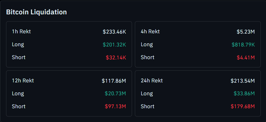 1 小时快照是唯一一个多头占主导地位的窗口,多头清算金额为 201.32 万美元,而空头清算金额为 32.14 万美元。