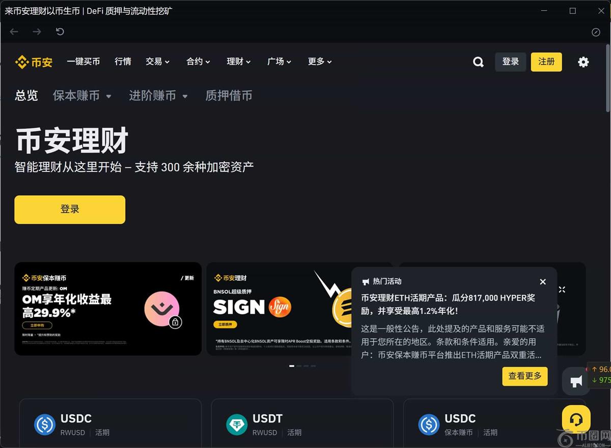 活期理财:随时存取,提供相对灵活的加密货币(如 BTC, ETH, USDT, BNB 等)和法币(如 EUR, AUD)的利息收益。