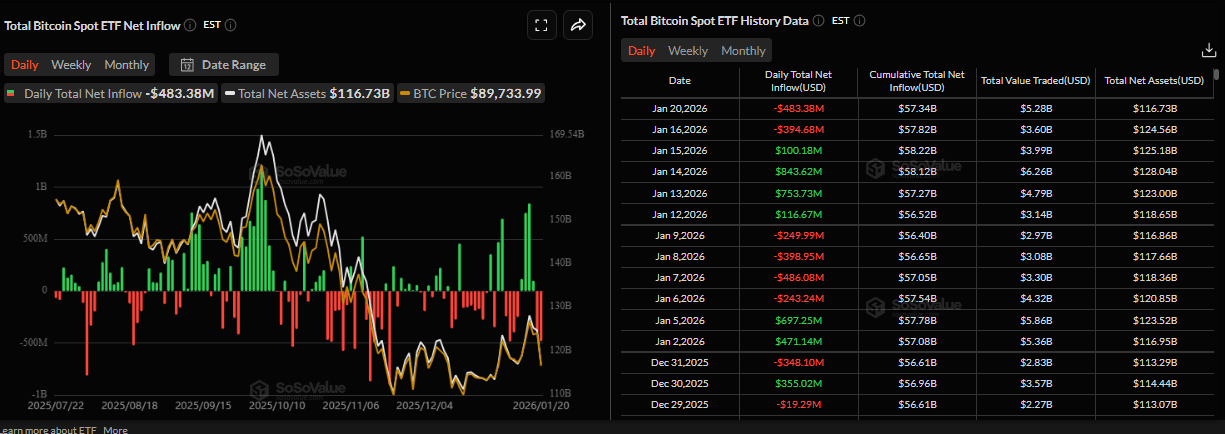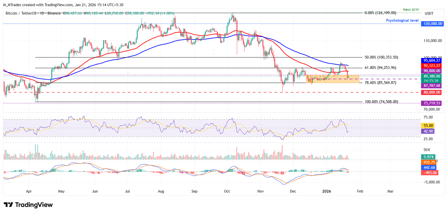 截至周三发稿时,比特币 (BTC) 价格徘徊在 9 万美元下方,此前六天累计下跌超过 8%。加密货币之王的下跌主要受地缘政治紧张局势加剧和日本债券市场动荡的影响。不过,投资者正密切关注美国总统特朗普周三在达沃斯的讲话,以从中寻找宏观风险演变的线索。