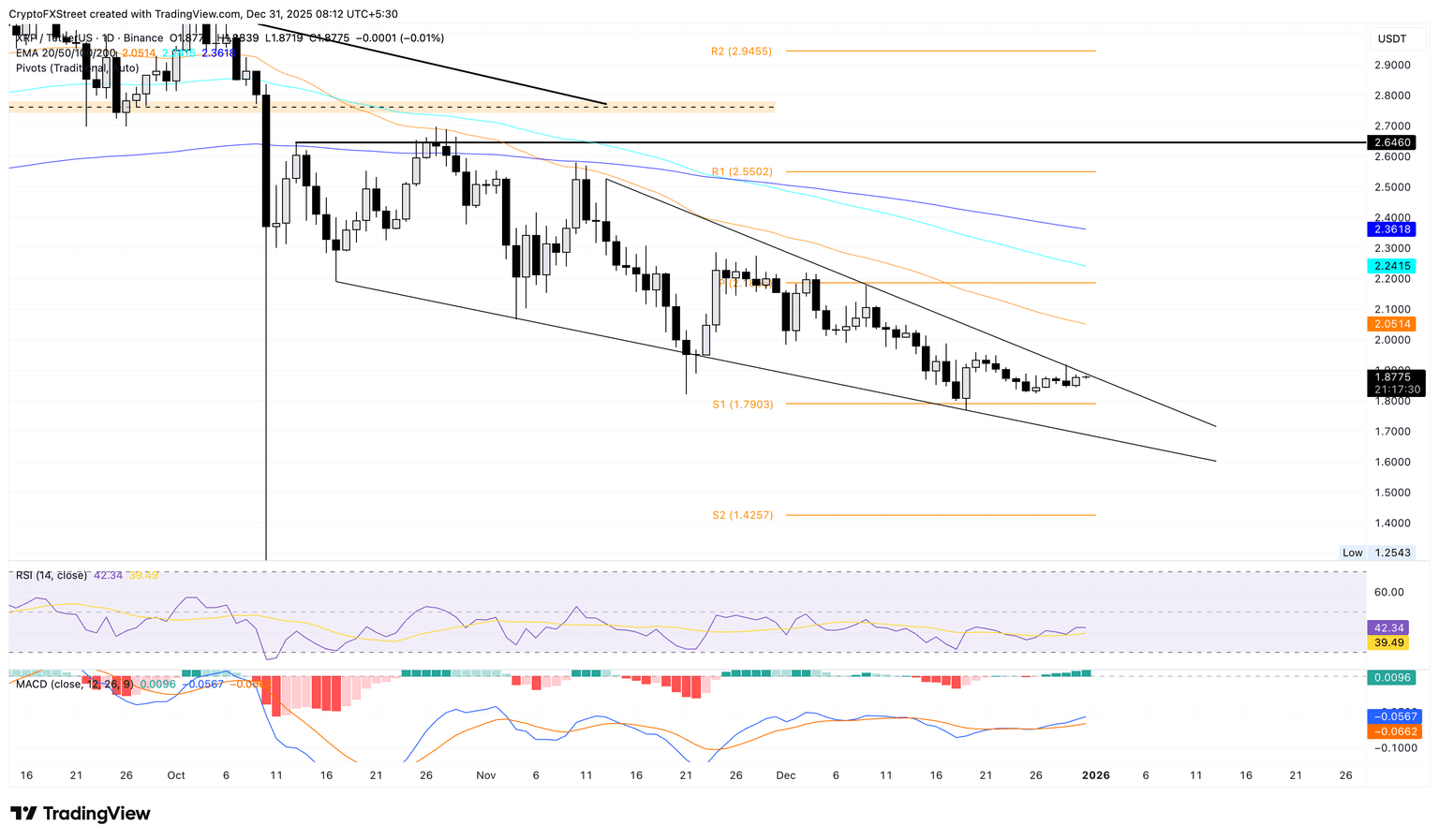 从下方看,如果 XRP 从 1.90 美元反转,可能会测试 1.79 美元的 S1 枢轴点,然后是 1.68 美元的支撑趋势线。