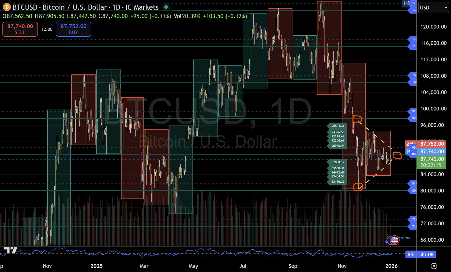 截至撰写本文时(2026年1月1日),BTC/USD交易接近87,498略高于微型 5 (87,008)此级别提供立即提供结构支撑.