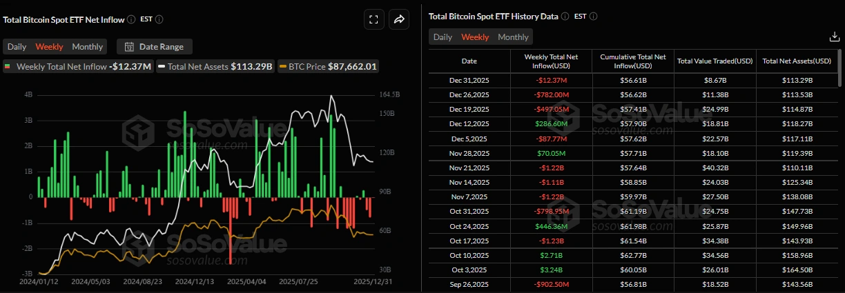 周五,比特币 (BTC) 价格在 89,000 美元附近交易,延续了近三周的横盘整理走势,市场参与者仍犹豫不决。机构需求持续疲软,现货比特币交易所交易基金 (ETF) 连续第三周出现小幅净流出。与此同时,年底流动性状况的改善有助于稳定整体风险情绪,目前比特币价格仍维持在窄幅交易区间内。