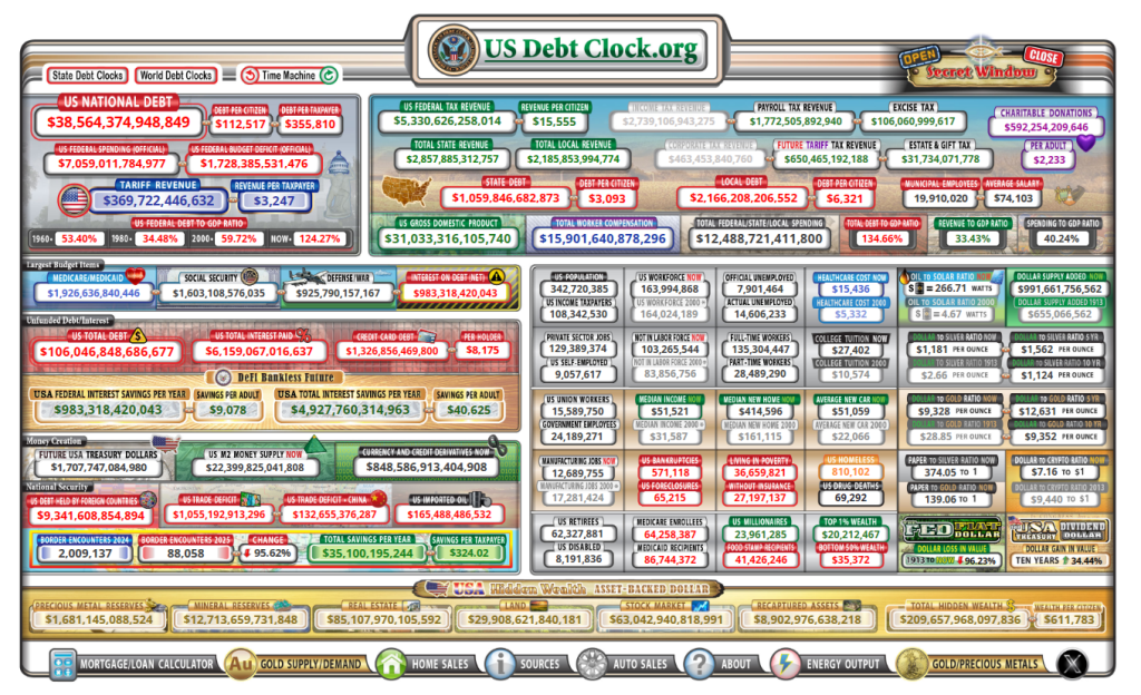 仪表板显示美国政府债务目前已超过 38 万亿美元,并且还在不断攀升。来源:美国债务时钟