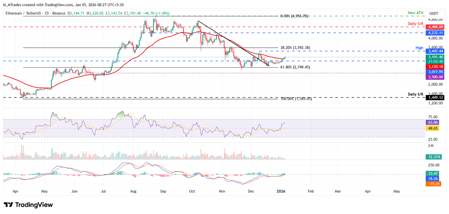 以太坊价格周五收于每日阻力位 3,017 美元上方,并小幅上涨,周日收于 50 日指数移动平均线 (EMA) 3,120 美元上方。截至周一,ETH 交易价格高于 3,190 美元。
