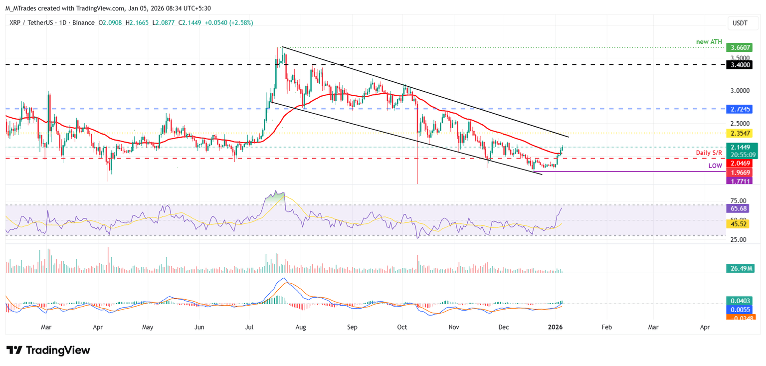 XRP 价格周五上涨近 7%,收于日阻力位 1.96 美元之上。接下来的两天继续上涨,超过了 2.04 美元的 50 日均线。截至周一撰写本文时,XRP 的交易价格高于 2.14 美元。