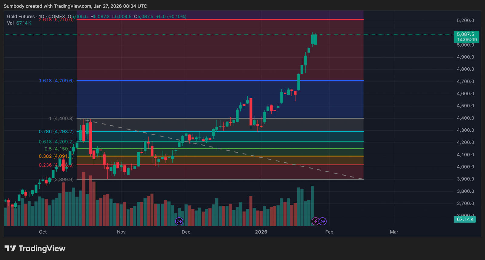 根据 TradingView 的数据,截至发稿时,黄金期货价格为每盎司 5,087 美元。大多数分析师预计上涨趋势将进一步延续,Bitget 首席执行官 Gracy Chen 也持相同观点。预测向 5400 美元的斐波那契水平迈进,并在 4830 美元的价格区域附近找到关键支撑。