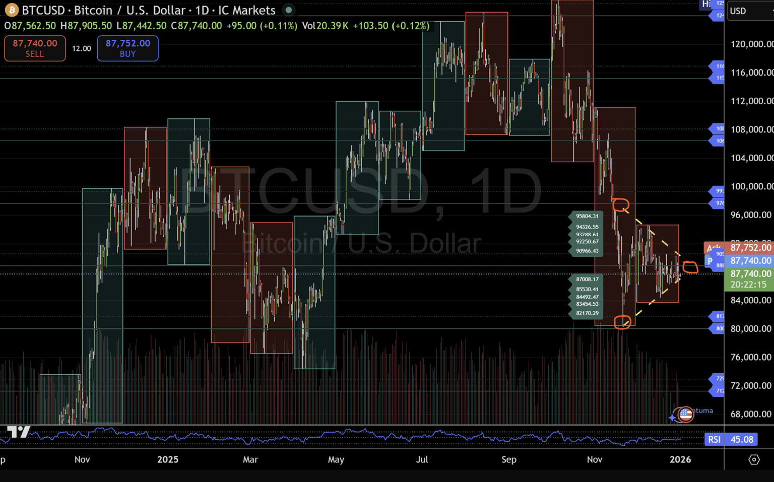 截至撰写本文时(2026年1月5日),BTC/USD交易接近91,200维持在该区域上方的接受度。也就是说,价格仍然足够接近关键参考值,该结构仍在测试中尚未证实。
