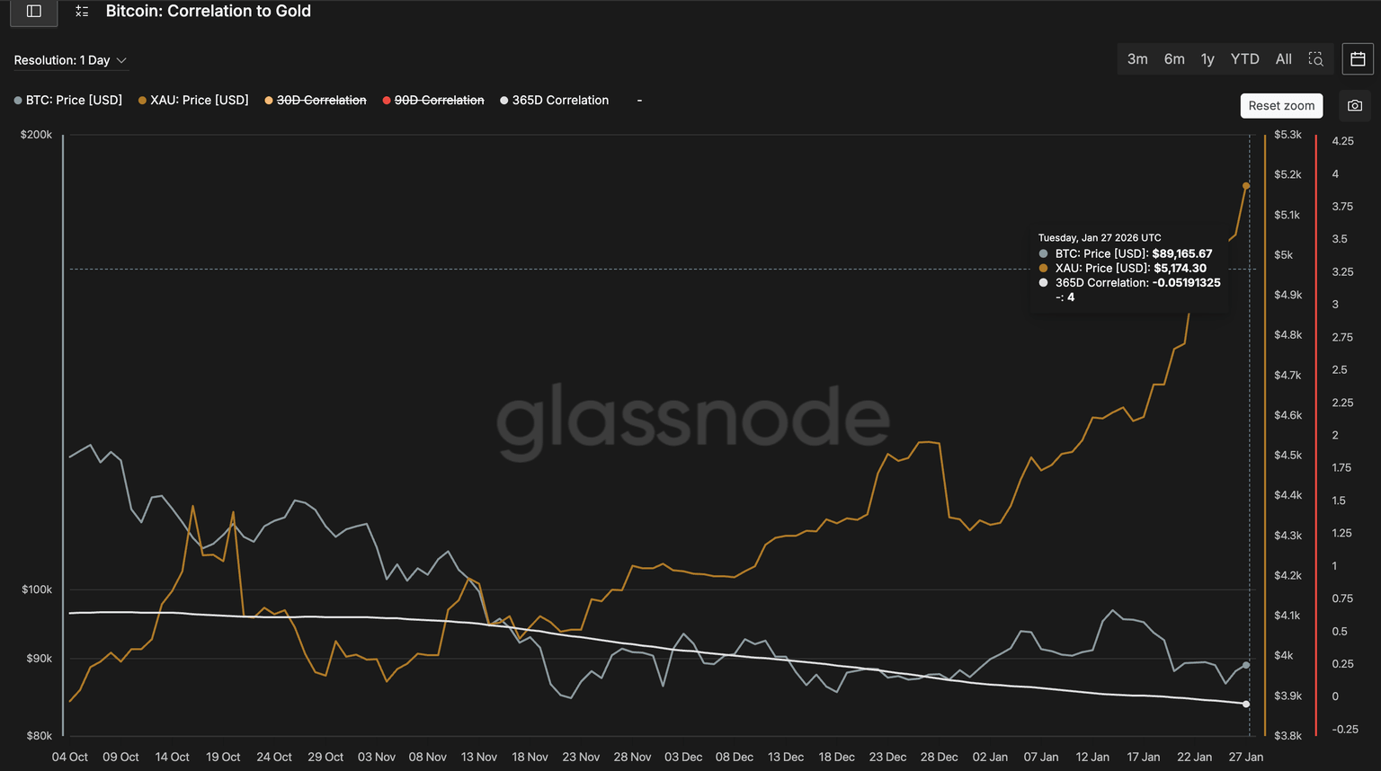 Glassnode数据显示,比特币的相关性过去 365 天,黄金价格下跌至 -0.051,因为这种金属受益于传统的避险资金流动,而比特币则仍然被困在一个区间内。