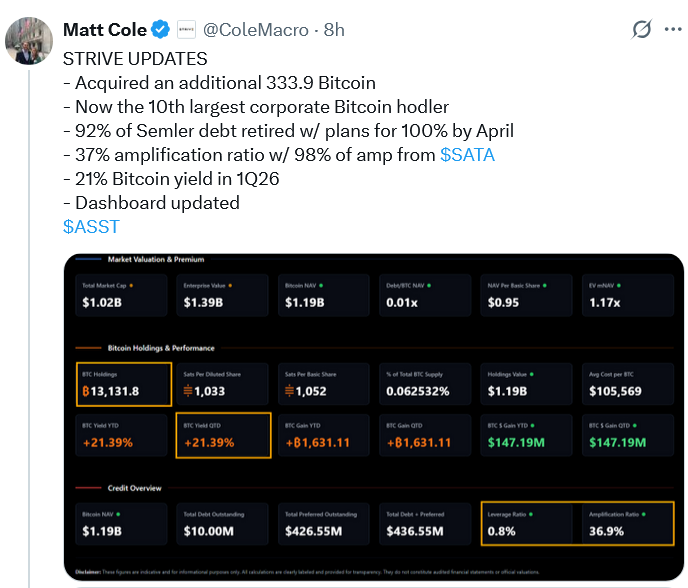 Strive补充称,随着Coinbase贷款结清,其比特币持仓已不再受任何抵押或质押限制,公司计划在未来四个月内还清剩余的1000万美元债务。