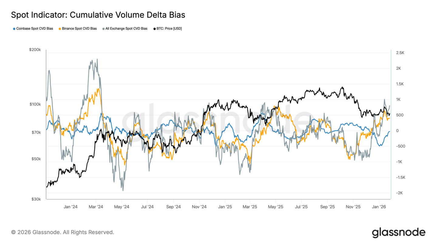 主要交易所的现货 CVD 偏向正在上升,显示市场买盘压力在长期低迷后开始回归。币安引领反弹,从深度负值快速回升;全交易所汇总的 CVD 偏向也已转正。