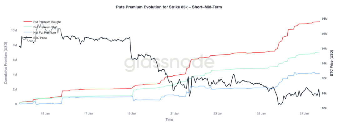 聚焦 8.5 万美元行权价的看跌期权权利金变化,可以发现期限上的分化行为:三个月以内的短期期权,净买入权利金占主导,推动净权利金上升;三个月以上的长期期权,则呈现净卖出权利金。