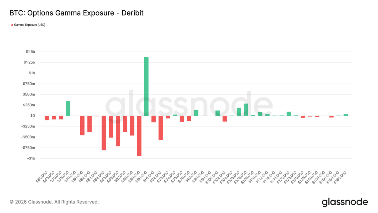 同时,在 9 万美元附近仍存在显著的多头 Gamma 集中区。这意味着要突破该价位向上,需要持续且强劲的买盘,而非零星买盘。
