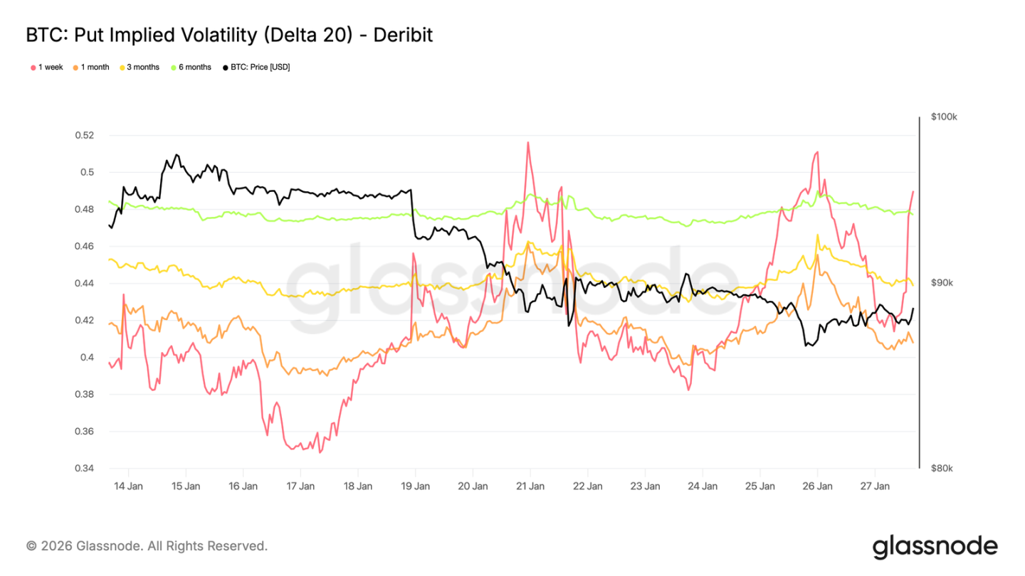 上周末,短期平价隐含波动率急剧上升,反映出市场对短期整体风险环境(而非仅加密货币本身)的敏感度提高。