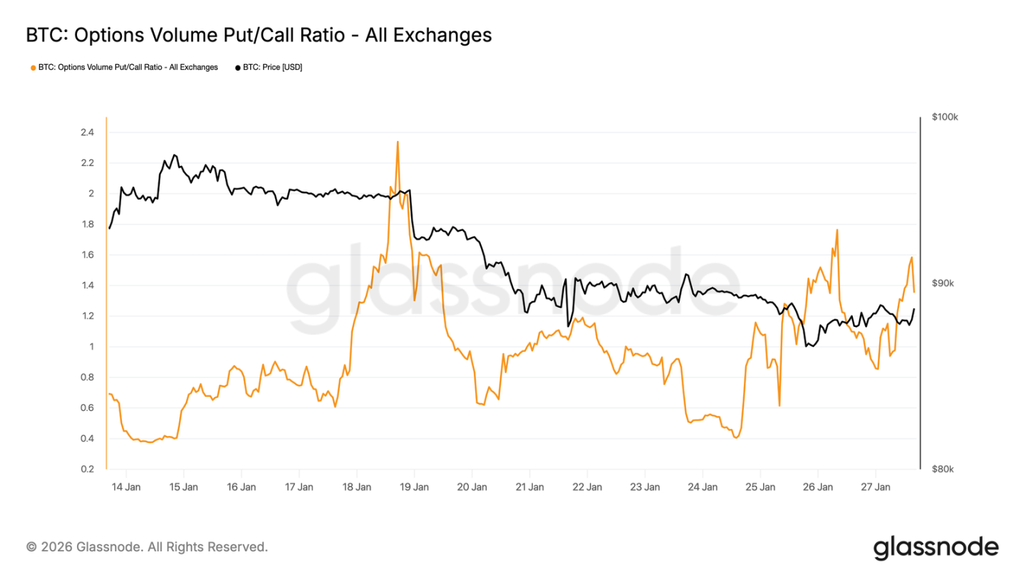 从交易量看,期权市场的看跌 / 看涨比率也证实了这种防御姿态。看跌期权交易量相对看涨期权有所增加,但并未出现通常与恐慌性对冲相关的交易量暴增。