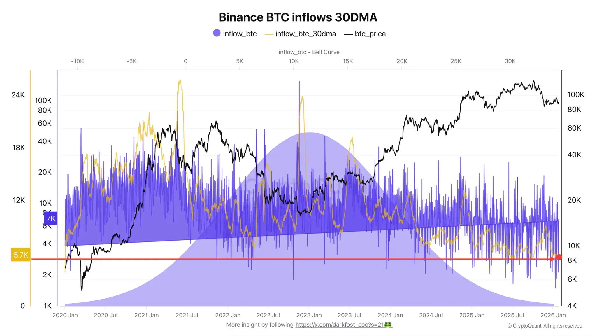 目前比特币月平均流入量约为 5,700-5,800 BTC,不到长期历史平均水平(约 12,000 BTC)的一半。
