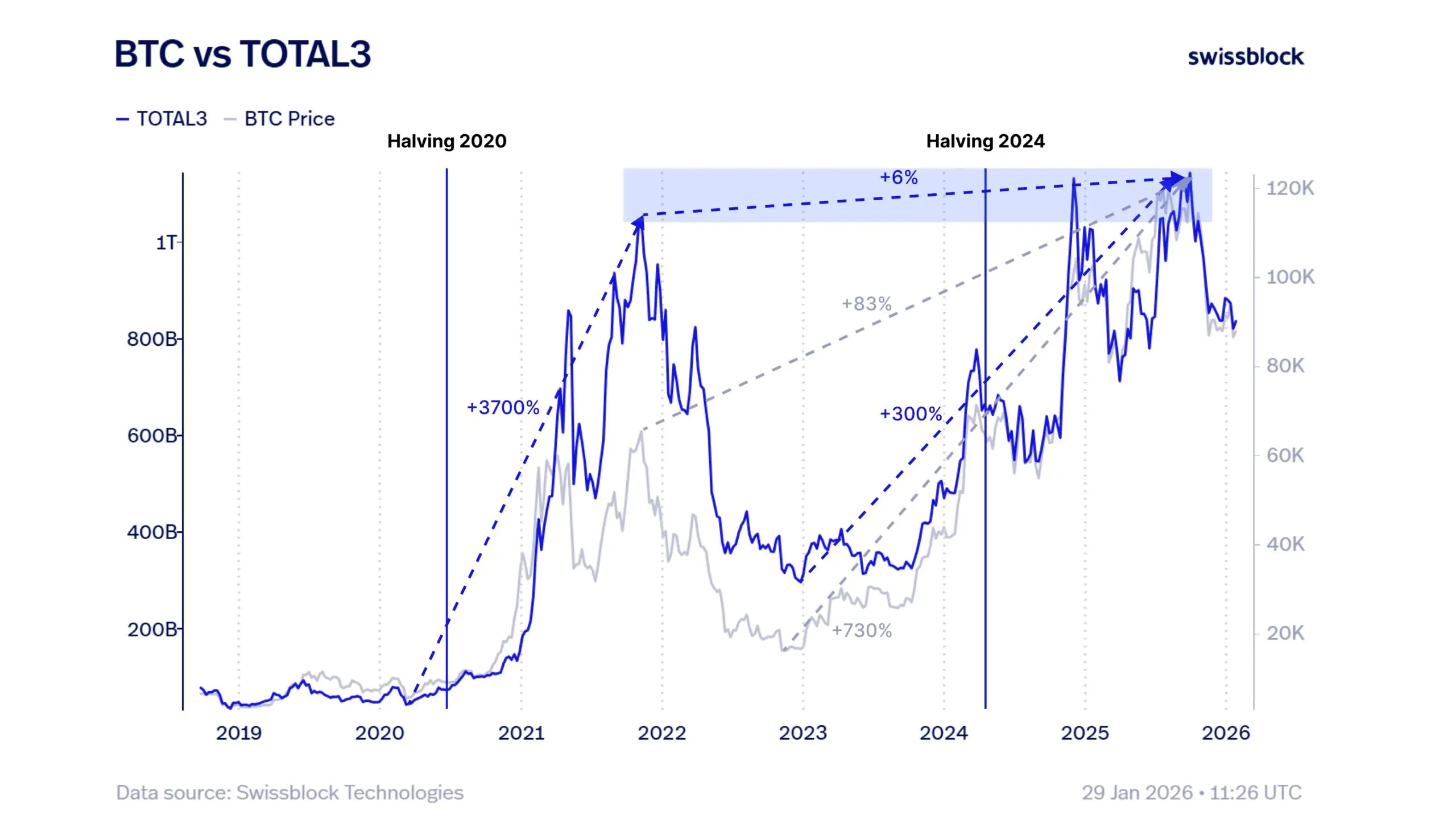 比特币价格已较前一周期高点飙升约 83%,这一里程碑式的涨幅是其他加密货币(山寨币)鲜有企及的。追踪除比特币和以太坊之外的加密货币市值的 TOTAL3 指数,目前仅比前一峰值上涨约 6%。