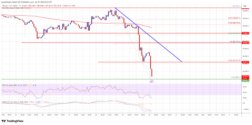 它避免了大幅下跌,价格跌破 82,000 美元。价格在 81,000 美元附近形成低点,并且仍然发出进一步下跌的信号。此外,在 BTC/USD 小时图上,一条下降趋势线正在形成,阻力位在 83,200 美元。
