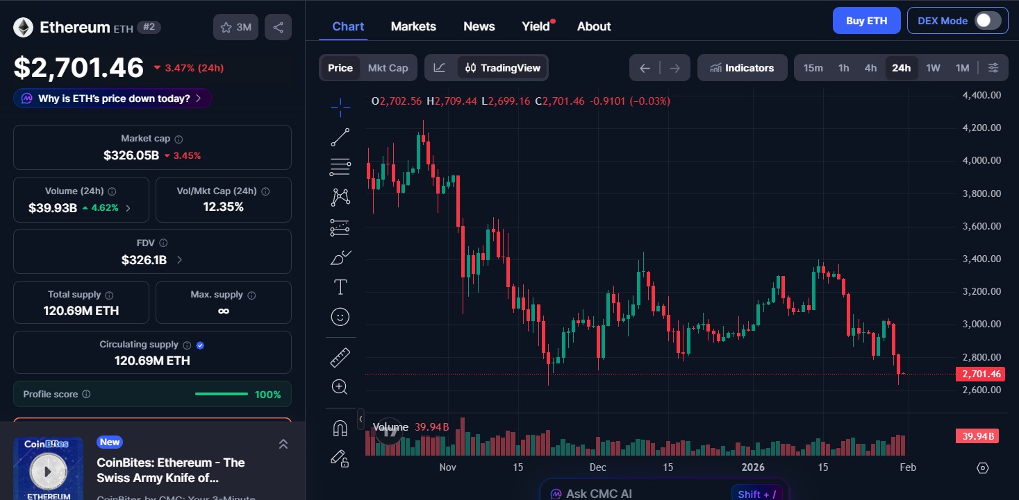 今日以太坊 (ETH) 价格股价为 2701.46 美元,24 小时内下跌 3.47%,交易量为 399 亿美元,市值为 3257.8 亿美元。