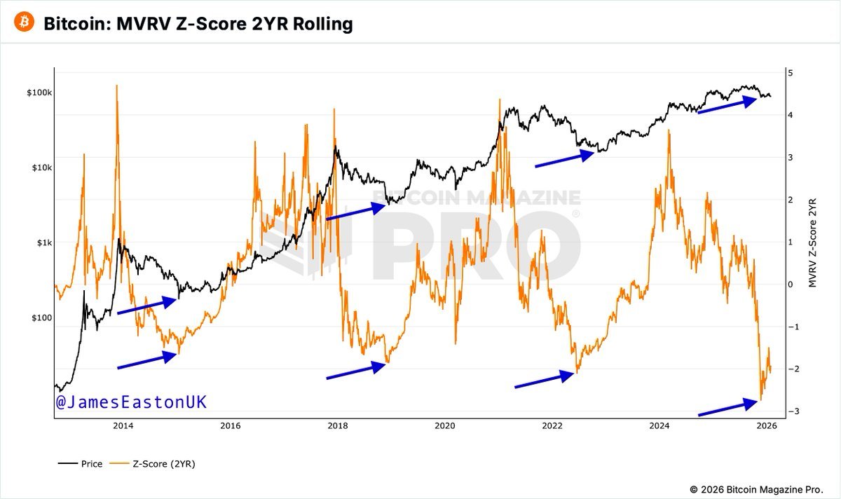 根据市场情况分析师Michaël van de Poppe 和 James Easton 指出,比特币 MVRV Z-Score 指标显示,过去四个月的熊市可能即将结束。值得注意的是,比特币在 10 月初触及 12.6 万美元的价格水平后,遭遇了巨大的抛售压力,价格两次回落至 8 万美元区域。