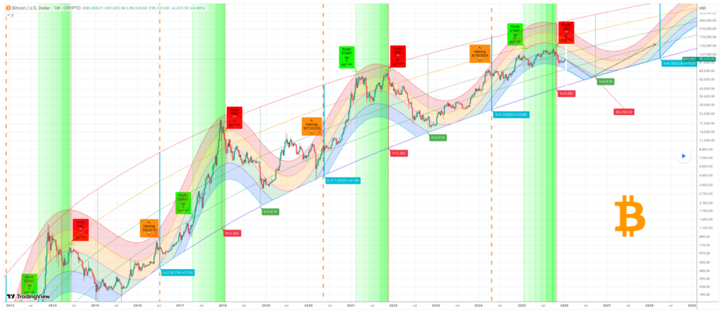 与此同时,彩虹周期图也支持这一观点,它将价格走势与减半事件联系起来。斐波那契时间扩展下一个主要时间目标是2026年9月最后一周的4.618斐波那契扩展位,该区域此前曾出现过周期低点。届时,模型预测比特币交易价格将在6万美元左右,较周期高点大幅下跌,但仍与其长期上升趋势相符。
