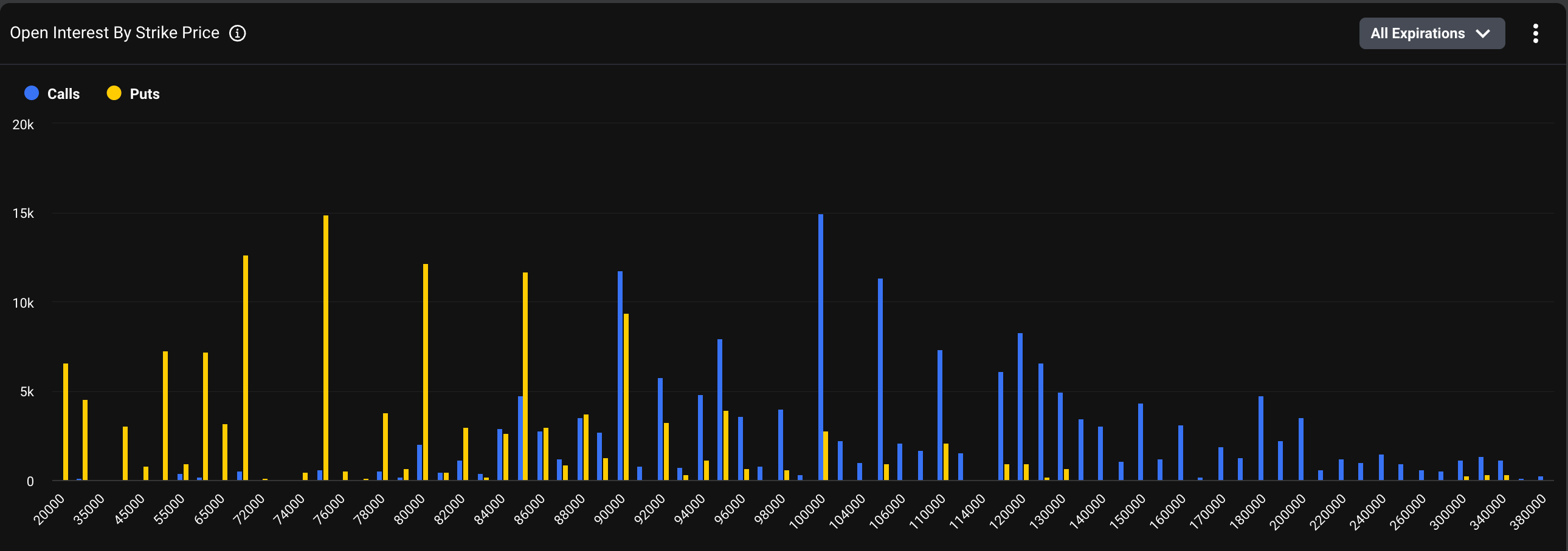 虽然行权价为 75,000 美元的看跌期权是最受欢迎的看跌期权,但行权价为 70,000 美元、80,000 美元和 85,000 美元的看跌期权也有大量未平仓合约,而行权价更高的看涨期权(除 100,000 美元的看涨期权外)则缺乏类似的交易活动。