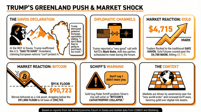 特朗普总统吞并格陵兰岛的意图所带来的地缘政治和经济影响,正引导投资者转向避险资产,例如:金子还有银。金子连续两日创下新纪录,历史上首次突破4700美元大关,而比特币跌破9.1万美元。