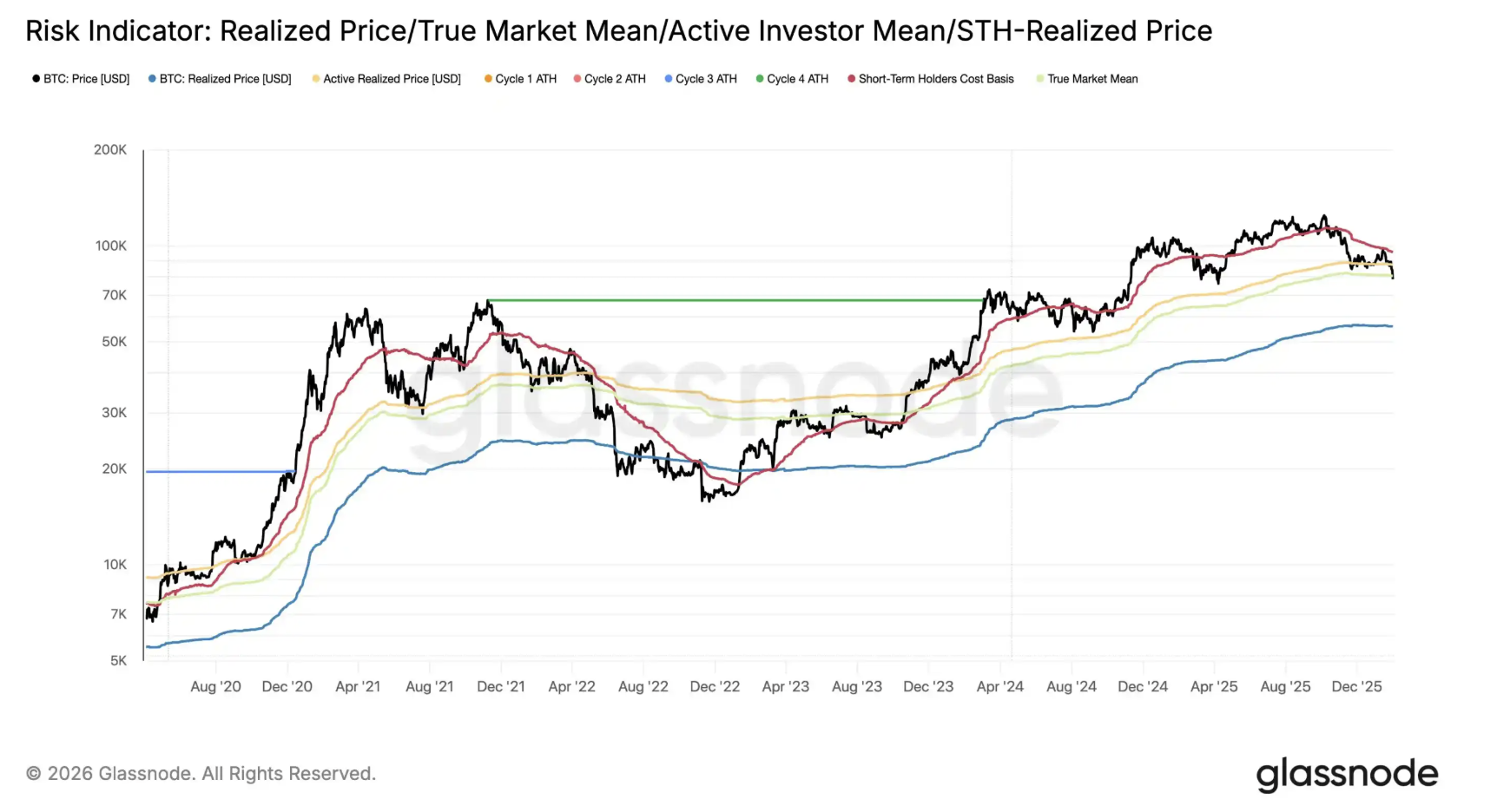 比特币跌破 7.8 万美元,glassnode 更新比特币链上关键价格分布如下:STH(短期持有者)成本基础,反映最近几个月新进场买家 / 交易者的平均持仓价格是 9.54 万美元。