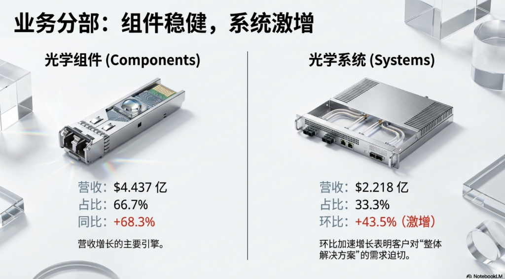 从产品线来看,Lumentum的组件和系统业务均实现强劲增长。
