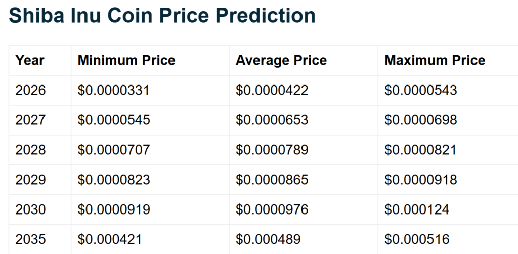 “柴犬币(Shiba Inu Coin)作为顶级网络迷因代币项目之一,长期来看将具有生存潜力。如果目前的上涨势头持续,到2035年,柴犬币的平均价格可能在0.000489美元左右。根据我们的价格预测,柴犬币到年底最高价格可能达到0.000516美元。然而,如果出现任何熊市趋势,柴犬币的最低价格在2035年可能跌至0.000421美元。如果市场出现牛市行情,柴犬币的价格在2035年可能会超过我们的预测。”