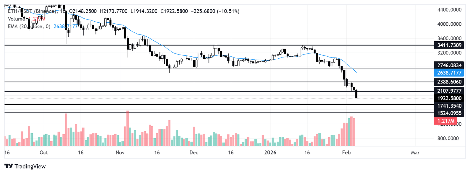 周四,以太坊 (ETH) 跌破 2000 美元,过去一周跌幅已达约 30%。