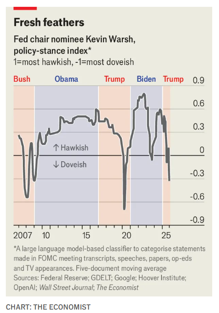 因此,沃什通常站在主张强力压制通胀的鹰派一边。《经济学人》使用人工智能模型,将他近200次演讲、电视露面和研究论文置于“鹰派-鸽派”光谱上进行定位。在今年之前,他唯一转向鸽派立场的时期都是在严重的危机期间:2007-09年的全球金融危机、新冠疫情以及2023年硅谷银行的倒闭。这种情况一直持续到特朗普赢得第二个任期。自那以后,他开始反复、强硬地呼吁降息,这与他年轻时的立场大相径庭。