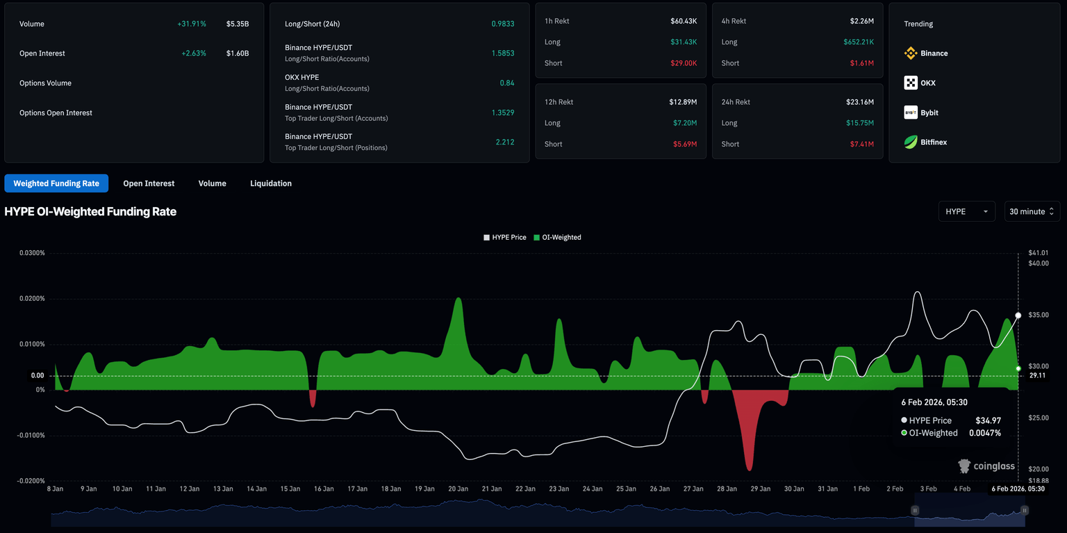 CoinGlass数据显示,HYPE的需求稳定,其期货未平仓合约(OI)在过去24小时内上涨超过2%,达到16亿美元。这些资金流入逆势而上,与整体市场的清算浪潮形成鲜明对比。