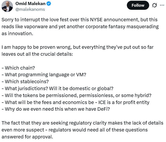 在周二(1月21日)发布的一则X帖子中,Omid Malekan表示,NYSE的公告读起来像是“vaporware(概念产品)”,许多关键问题仍未得到解答,包括该区块链将构建在哪条链上、代币是许可型、非许可型还是二者结合,以及代币经济模型和费用结构将如何设计。