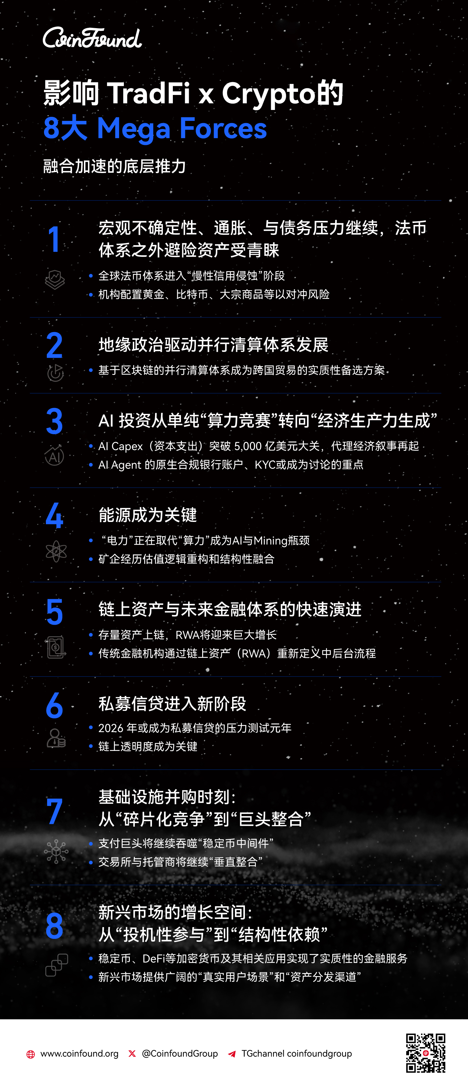 作者:CoinFound,TradFi × Crypto数据科技公司原文标题:2026年TradFi x Crypto展望:驱动2026年的8大宏观力量与7大投资趋势1 月 21 日,CoinFound 正式发布《CoinFound 年度报告:TradFi x......