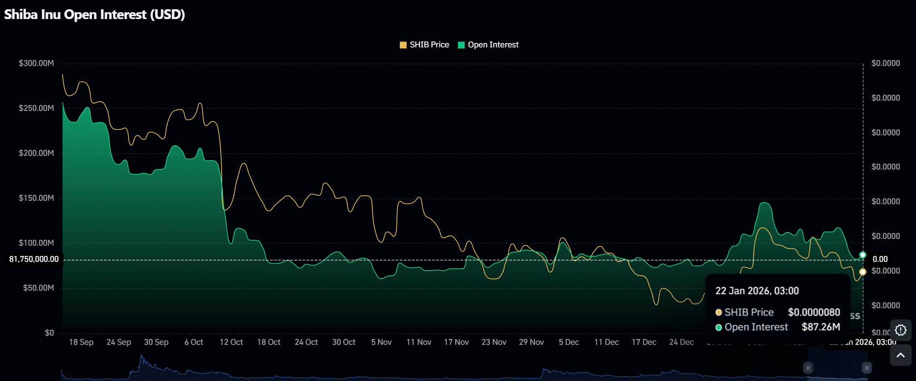 然而,在达到约1.45亿美元的峰值并回落至8225万美元后,市场开始出现积极转变。截至2026年1月22日,未平仓合约量已开始回升,约为8726万美元。