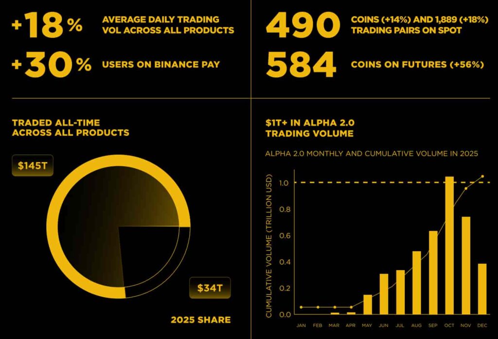 报告显示,币安的总交易额达到 34 万亿美元。贸易2025 年所有产品的交易量。此外,现货交易量超过 7.1 万亿美元,平台日均交易量同比增长 18%。