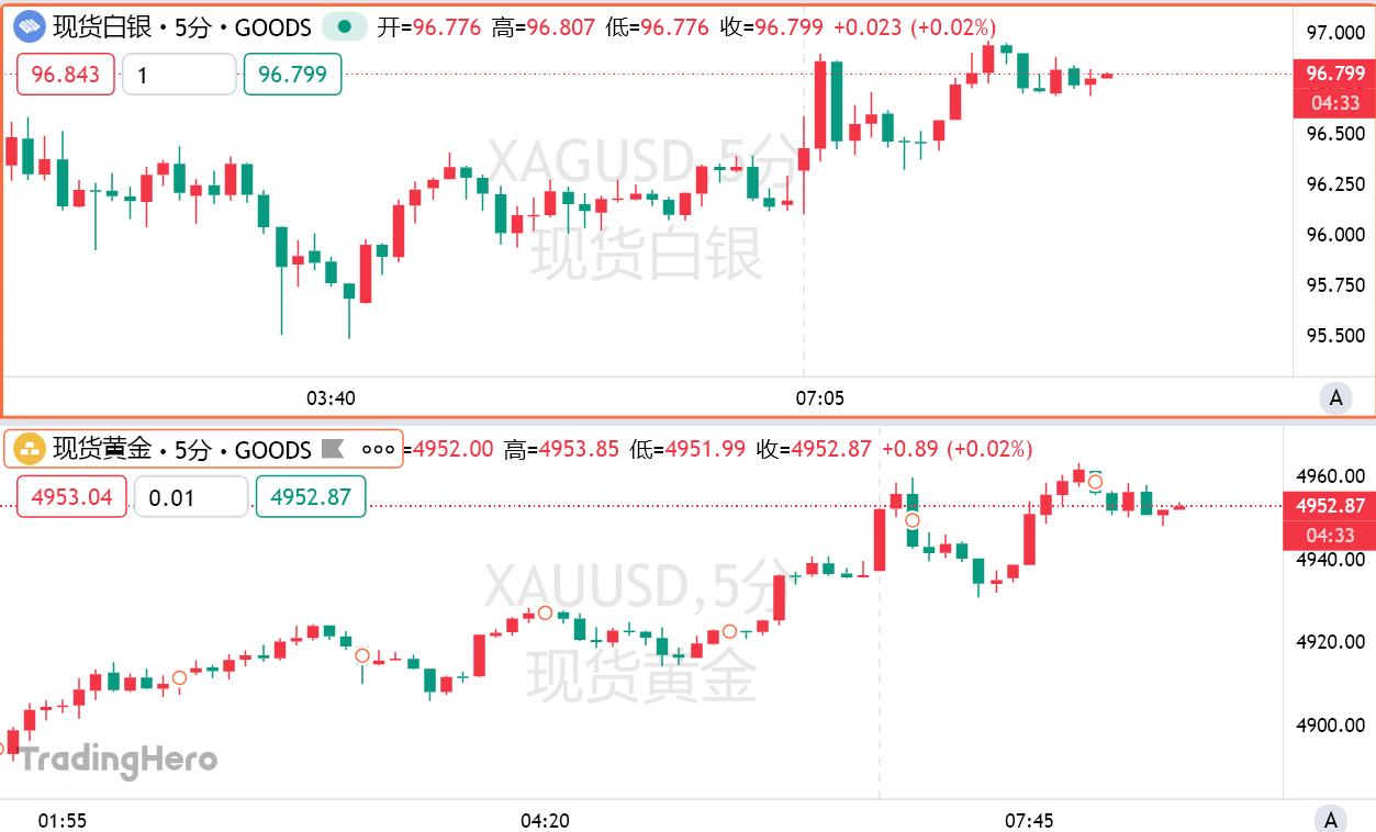 周五亚市盘初,现货黄金站上4950美元/盎司关口,再创历史新高。现货白银报96.79美元/盎司。