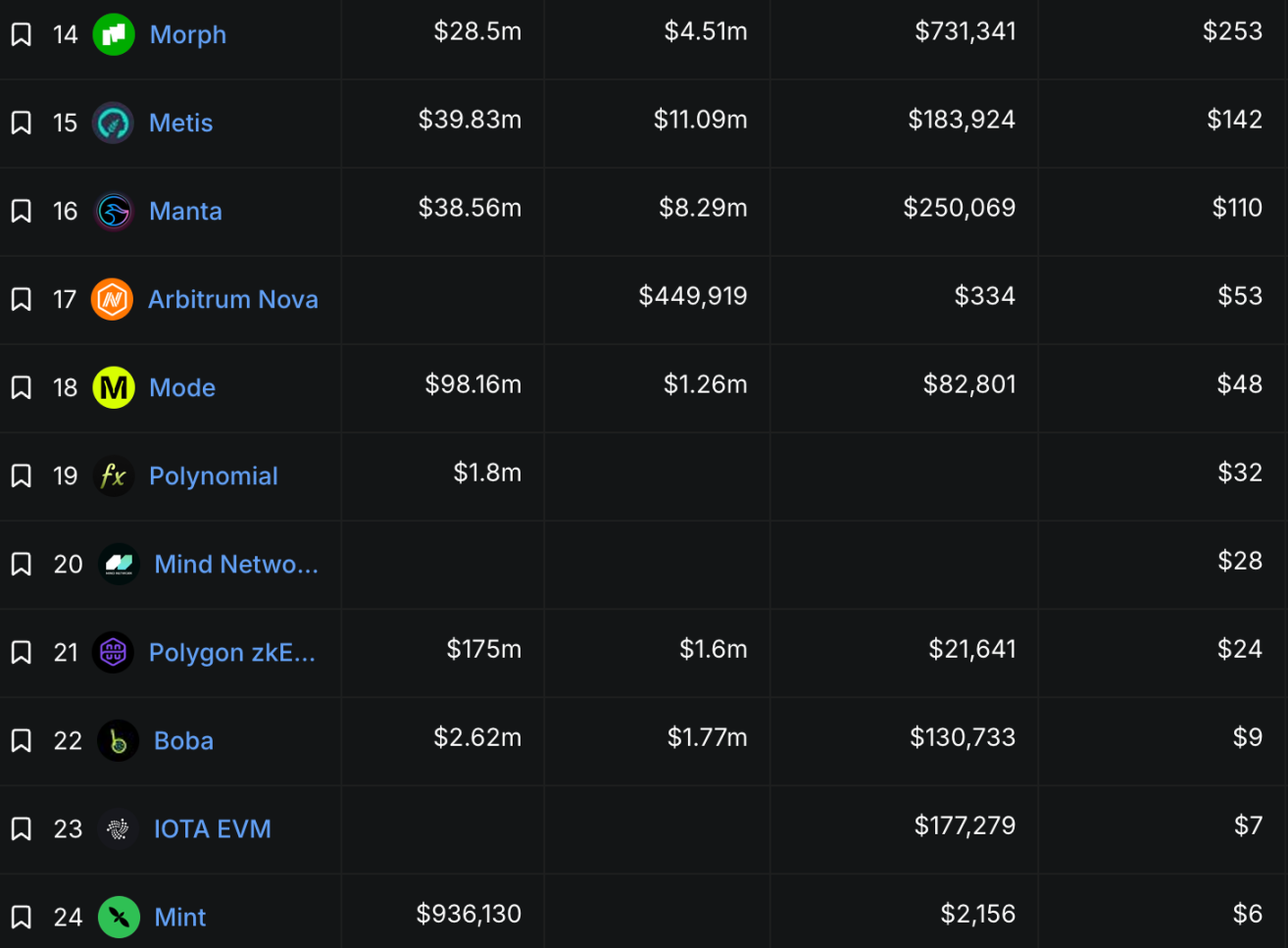 数据显示,通用 L2 中除了 Base、Polygon 之外,甚至 Arbitrum 和 OP Mainet 的 TPS 都没有大幅超过以太坊。Linea、Starknet 的 TPS 不到 3,截图没有截到的部分还包括了 TPS 略超 1 的 Scroll 以及不到 1 的 ZKsync、Blast 等。