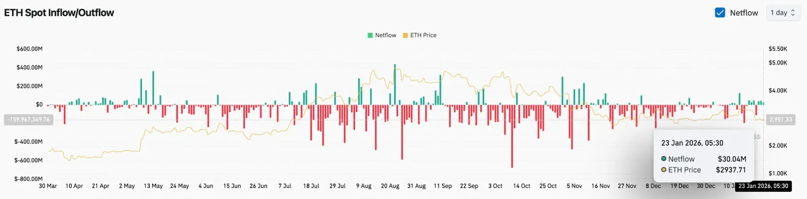 交易所资金流动数据显示,买家在市场疲软期间入场。Coinglass 数据显示,1月23日净流入资金达3004万美元,延续了此前调整期间持续的资金积累趋势。