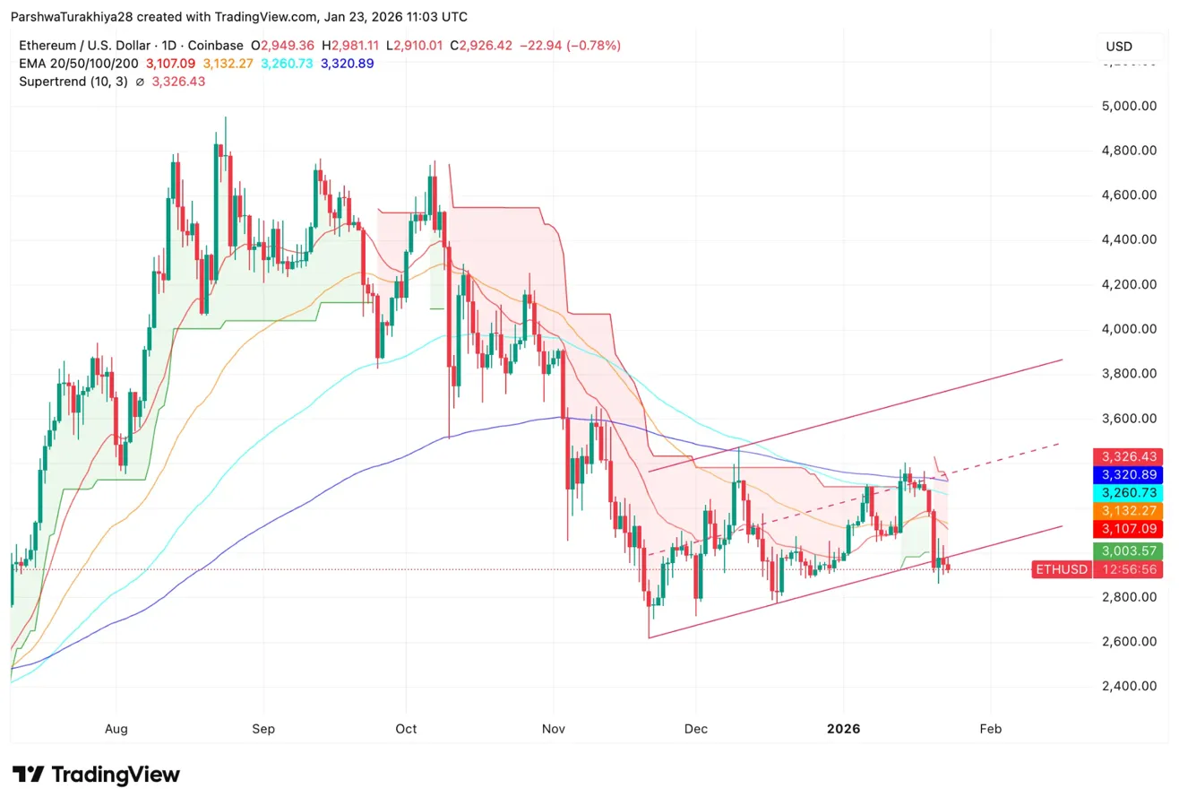 较短时间周期显示出短期压力。在小时图上,自1月19日抛售潮以来,ETH已形成下降三角形形态。价格不断创出新高,而支撑位在2920美元附近保持稳定。