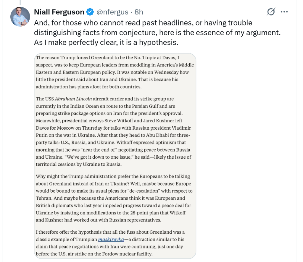 知名历史学家尼尔·弗格森1月24日在社交媒体X上发表最新观点,特朗普近期在达沃斯论坛上高调炒作“购买格陵兰岛”议题,实则是一场精心策划的战略佯攻。