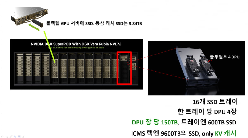 NVIDIA CEO 黄仁勋在 CES 2026 上推出 ICMS。图片由 NVIDIA YouTube 提供。DPU 超大容量 SSD = KV 缓存存储专用团队